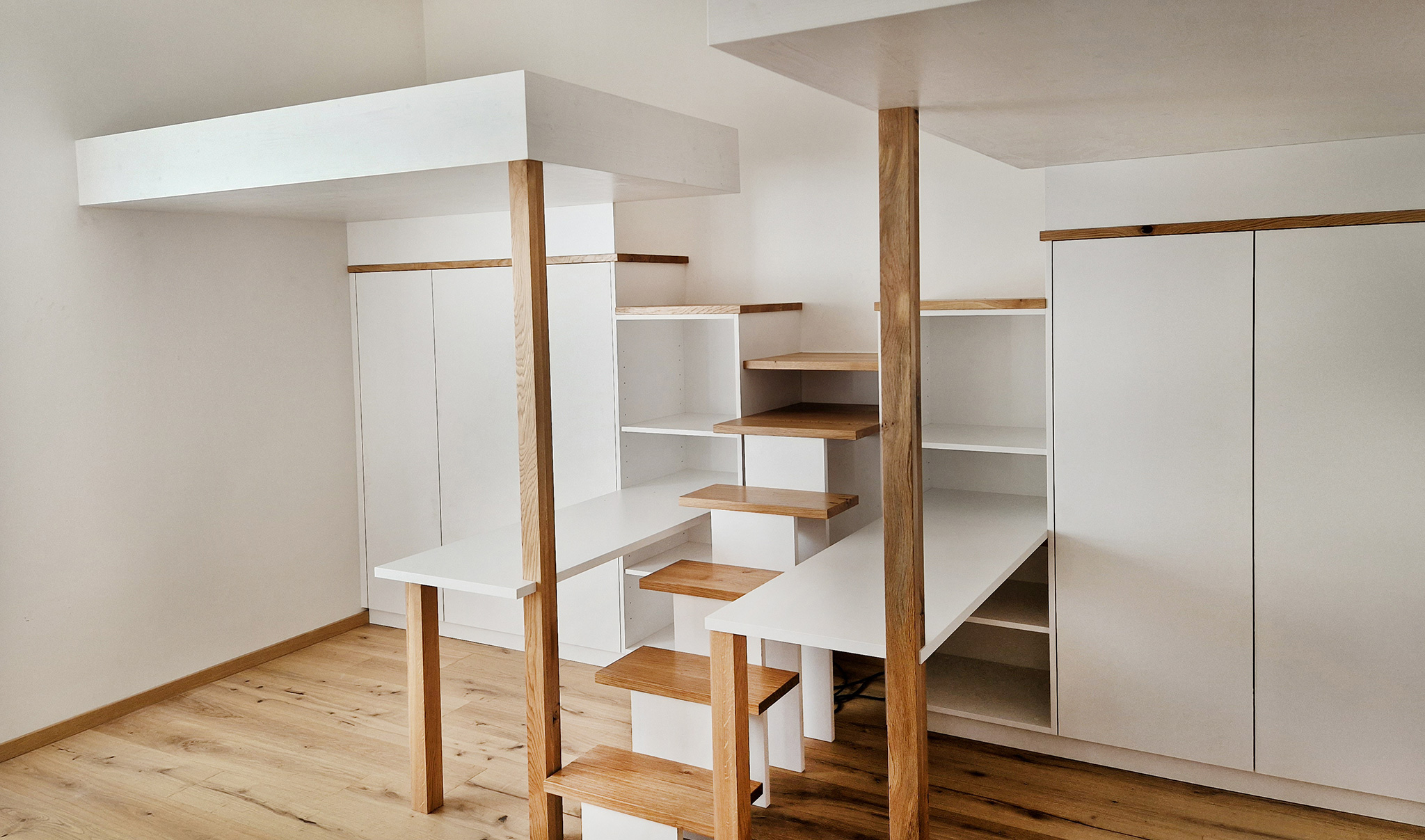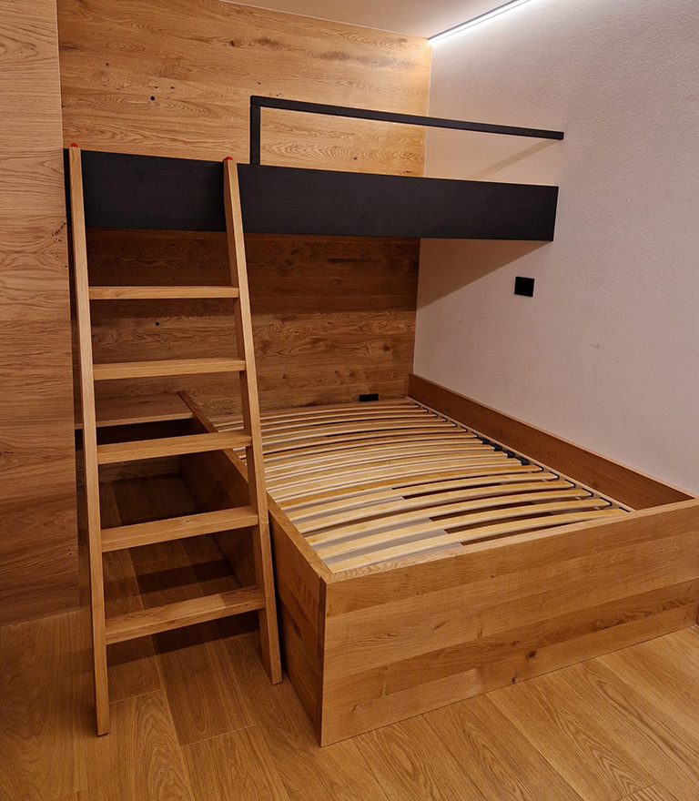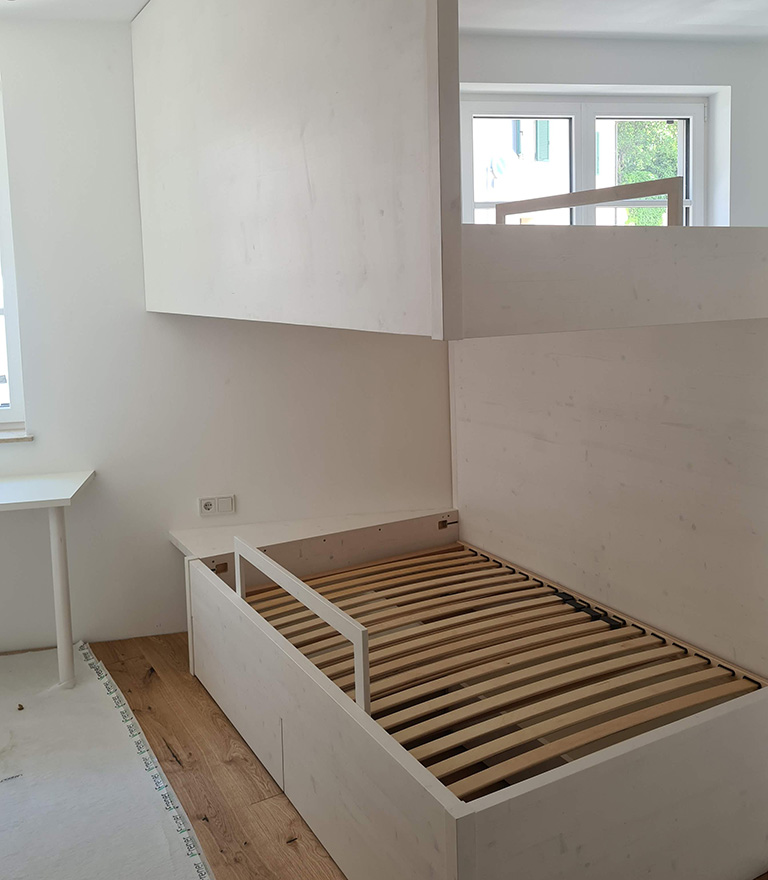 Nessuna stanza è troppo piccola per noi. In Mansarda e nella camera standard: c’è sempre una soluzione ideale. Letti ribaltabili, elevatori e sospesi, il trucco sta nella combinazione di design e sicurezza! È possibile scegliere da un’ampia gamma di legni. I nostri letti vengono fissati individualmente secondo le possibilità che offre la stanza, in modo da creare soluzioni uniche e fuori dall’ordinario.